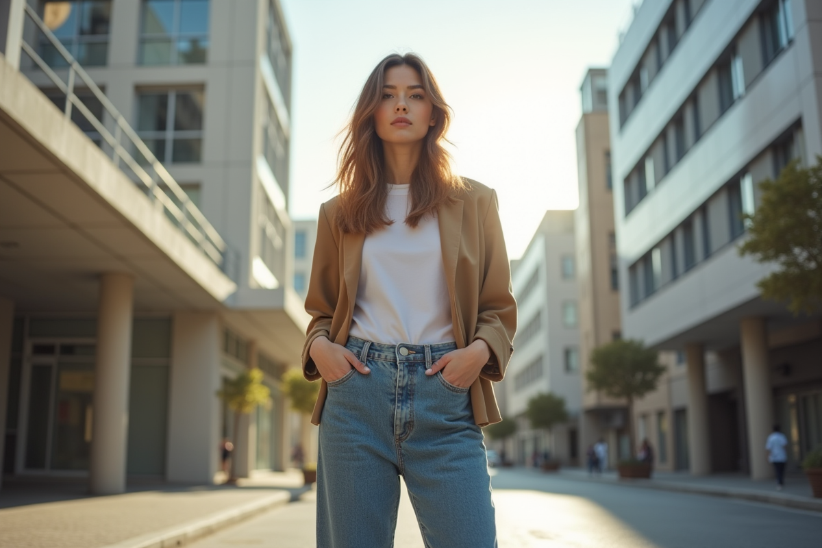 Le choix du tissu compte aussi : denim stretch pour plus de confort, denim brut pour une structure nette, denim fluide pour un rendu aérien. Ce qui fait la différence, c’est le tombé : ni trop flottant, ni trop rigide.